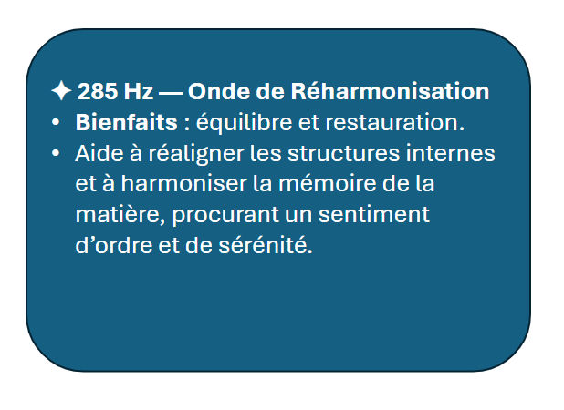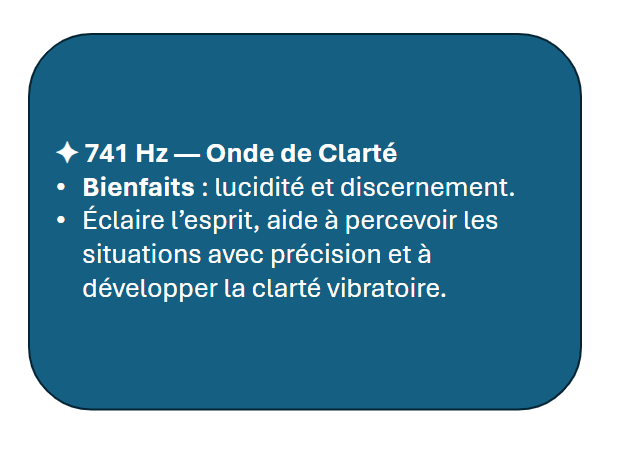 Nos Eaux Vibratoires sont exposées à neuf fréquences sacrées, chacune choisie pour harmoniser, élever et transformer l’énergie personnelle. Ces ondes, inspirées des traditions ancestrales et de la science des vibrations, apportent des bienfaits subtils mais puissants à votre corps et esprit.